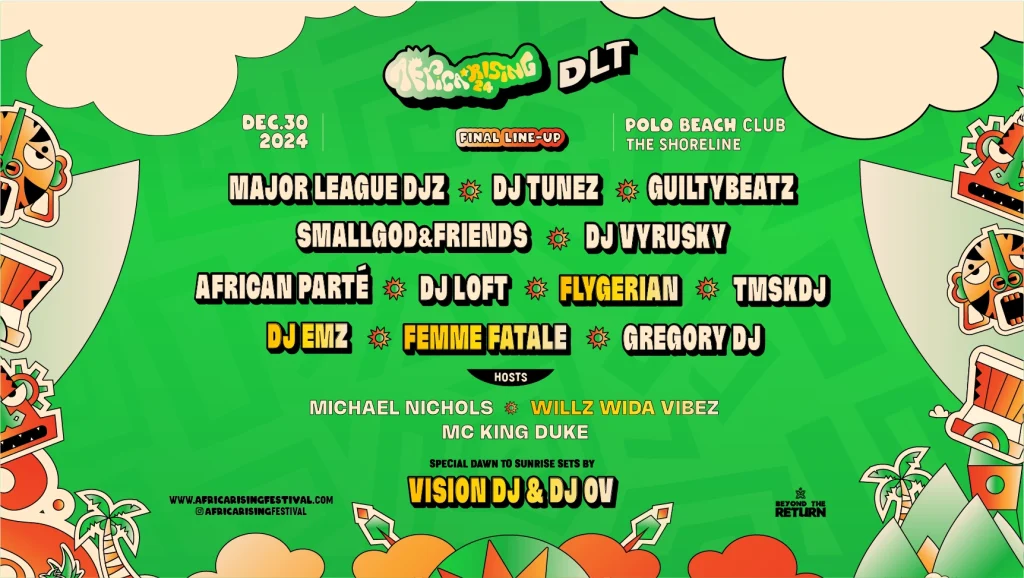 Attendees can enjoy a dynamic DJ-led show on the beach, live performances from top African artists, immersive art displays, and a curated vendor space with food, drinks, and merchandise.